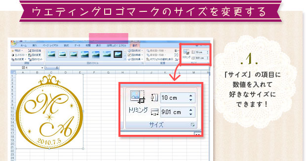写真やイラストを配置するのと同じように、ウエディングロゴマークのデータを配置するだけで、